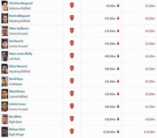 北京时间12月9日,德转公布了最新一期的英超球员身价榜,阿森纳这边,萨利巴和廷贝尔身价上涨1000万,萨卡下跌1000万欧至1.3亿欧。