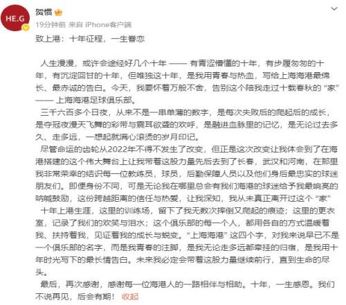 贺惯在文中说,我要怀着万般不舍,告别这个陪我走过十载春秋的 “家”——上海海港足球俱乐部。过去的三千六百多个日夜,从来不是一串单薄的数字,是每次失败后的爬起后的成长,是夺冠夜漫天飞舞的彩带与震耳欲聋的欢呼,是融进血脉里的记忆,是无论过去多久、走多远,一想起就满心滚烫的岁月印记。