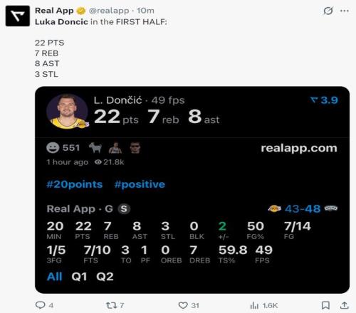 次节东契奇的三分手感明显下滑了,单节三分3中0,不过他的得分账户还在添加,单节拿到10分4篮板3助攻,半场20分钟,14中7,已经拿到22分6助攻7篮板3抢断的准三双数据,东契奇已经算独扛一队了。