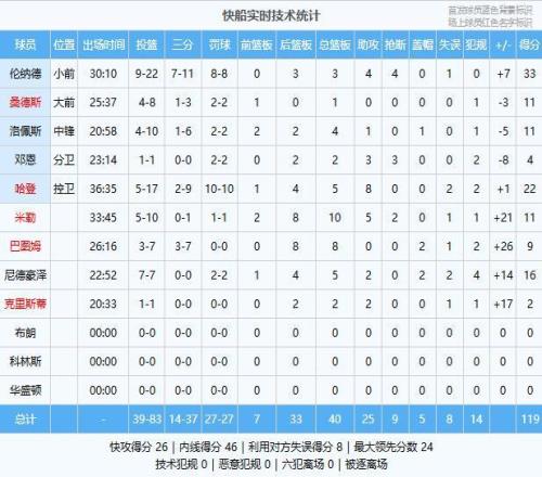 快船:伦纳德33分3板4助4断、哈登22分5板8助、尼德豪泽16分5板2助2帽、米勒11分10板5助2断、洛佩斯11分4板1助、桑德斯11分1板、巴图姆9分8板2帽