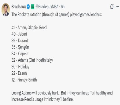 火箭记者Bradeaux晒出本赛季火箭主力们的轮换场次,目前只有阿门、奥科吉、谢泼德三人打满了41场比赛,而伊森因伤只打22场,亚当斯虽然打了32场但目前已经无限期停赛,火记的意思是只要伊森能继续保持健康,让后乌度卡提升谢泼德的登场时间依旧有超强战力。