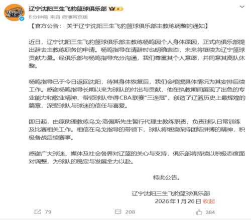 26日下午,@辽宁沈阳三生飞豹篮球俱乐部 发布公告:近日,辽宁沈阳三生飞豹篮球俱乐部主教练杨鸣因个人身体原因,正式向俱乐部提出辞去主教练职务的申请。杨鸣指导在请辞时也明确表态,未来将继续为辽宁篮球贡献力量。经俱乐部与杨鸣指导充分沟通,我们尊重其个人意愿,并同意其离队休整。